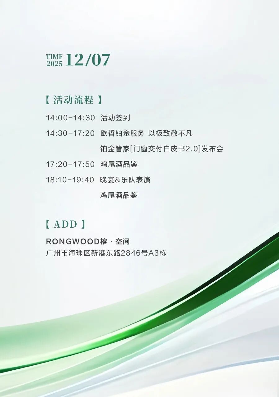 远见未来人居趋势,探究品质生活进化。欧哲与孙建亚先生的合作,将怎样诠释品质落地细节,匹配用户对家的美好想象?12月7日,中国广州,「欧哲铂金服务 以极致敬不凡」,2025铂金管家《门窗交付白皮书2.0》发布会即将揭晓,诚邀见证!