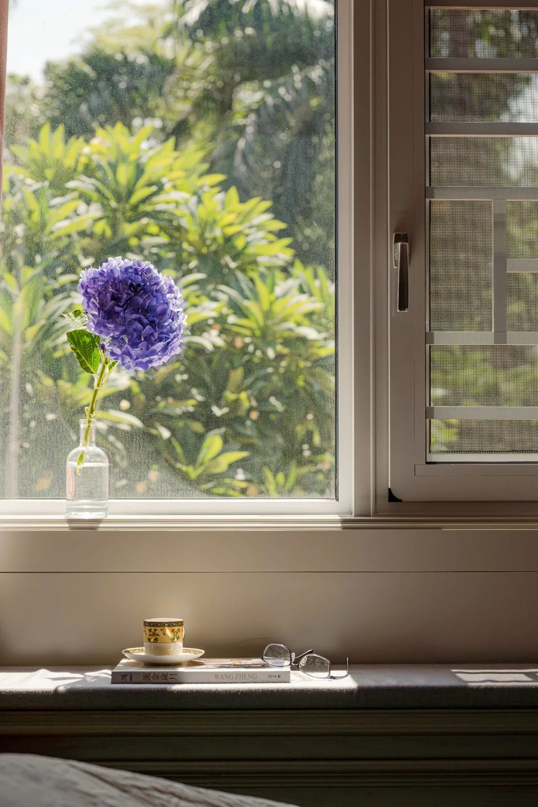 三楼的两扇窗户,一扇正对着盛开的三角梅,在有限的空间里畅想窗外无限的空间,每个角度都能带来极佳的视觉享受。通过窗,空间发生了微妙的变化,清晨时朝气蓬勃,黄昏时温柔静谧。
