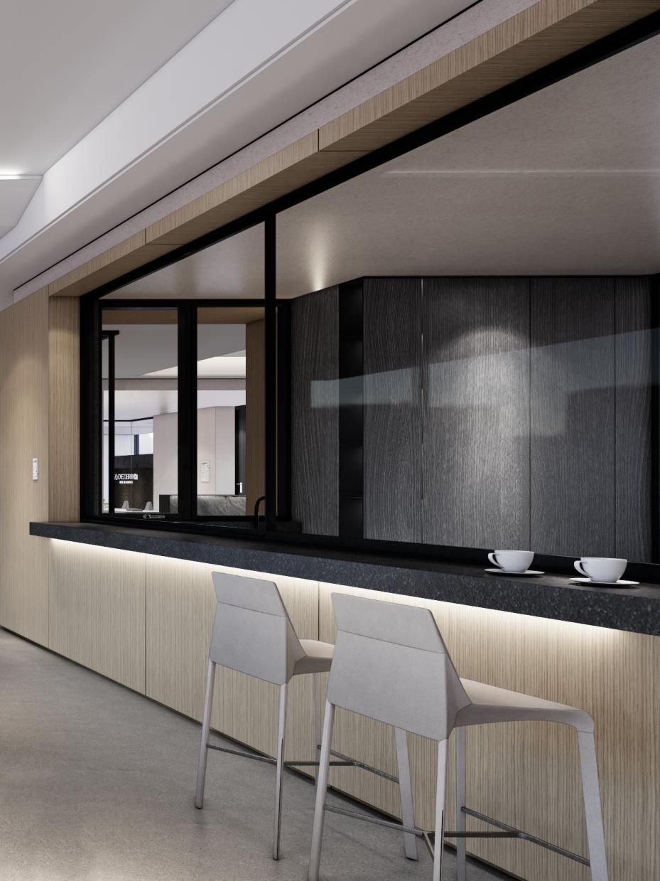 自由边界室内窄扇推拉门,270°转角围合半开放茶室和咖啡吧。